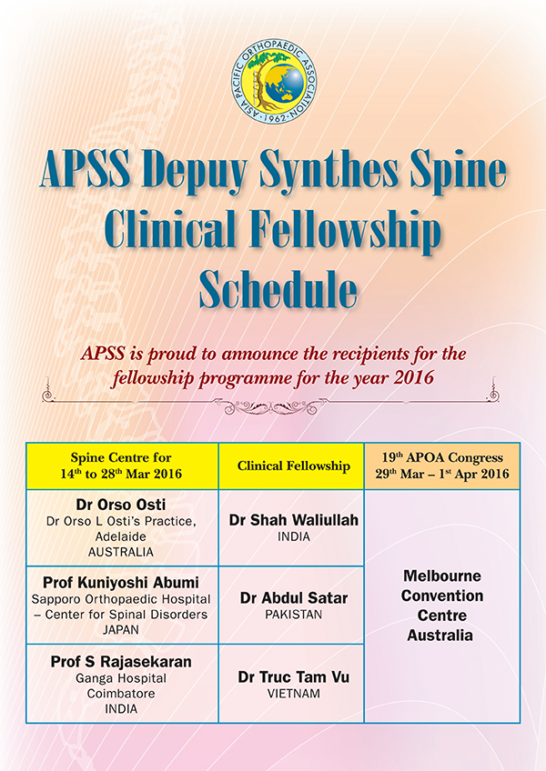 Three (3) to Four (4) fellowships will be awarded. Each fellow will spend 3 weeks in a spine centre of excellence in the Asia Pacific Region. This fellowship provides a unique opportunity to interact with and learn from renowned spine surgeons in the Asia Pacific region.