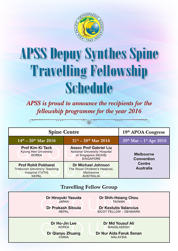 Eight (8) fellowships will be awarded. The fellows will be divided into 2 groups. Each group will visit spine centres of excellence in 3 countries in the Asia Pacific Region. The duration of the Fellowship will be 3 weeks.